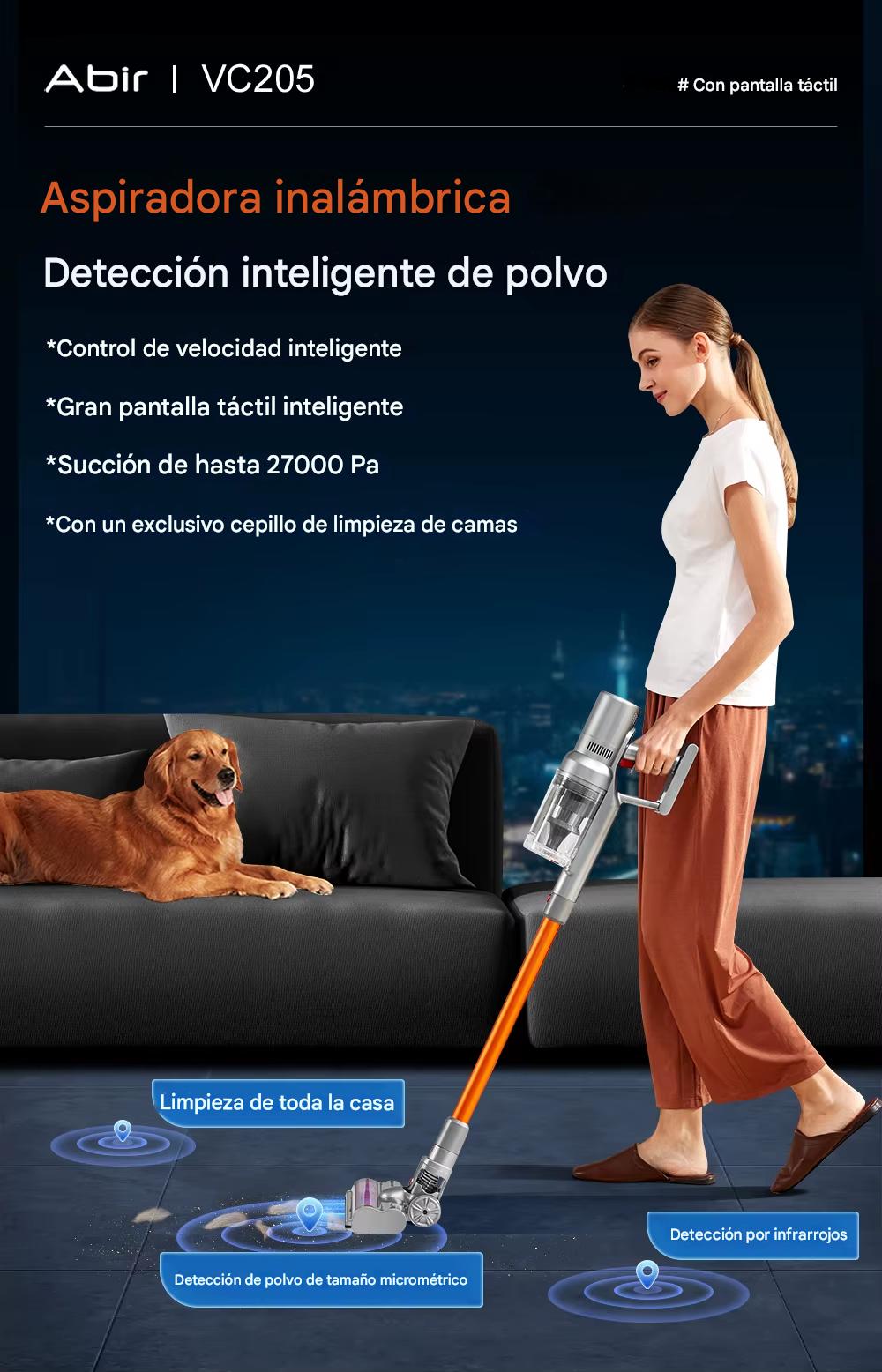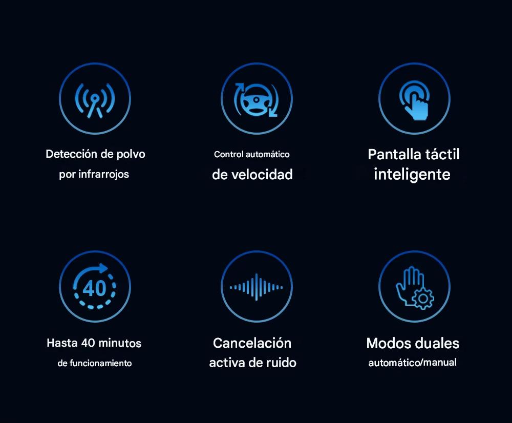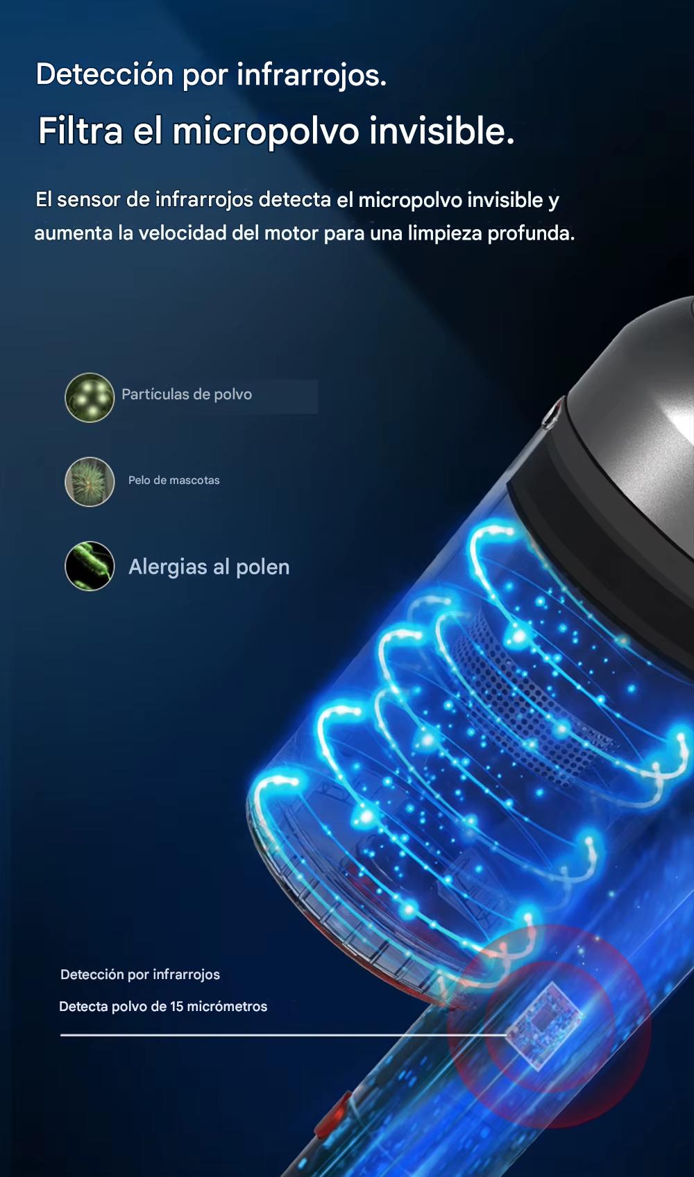 1.Detección de polvo por infrarrojos, detecta y mide partículas de tamaño micro, aumenta de manera inteligente la velocidad del motor.