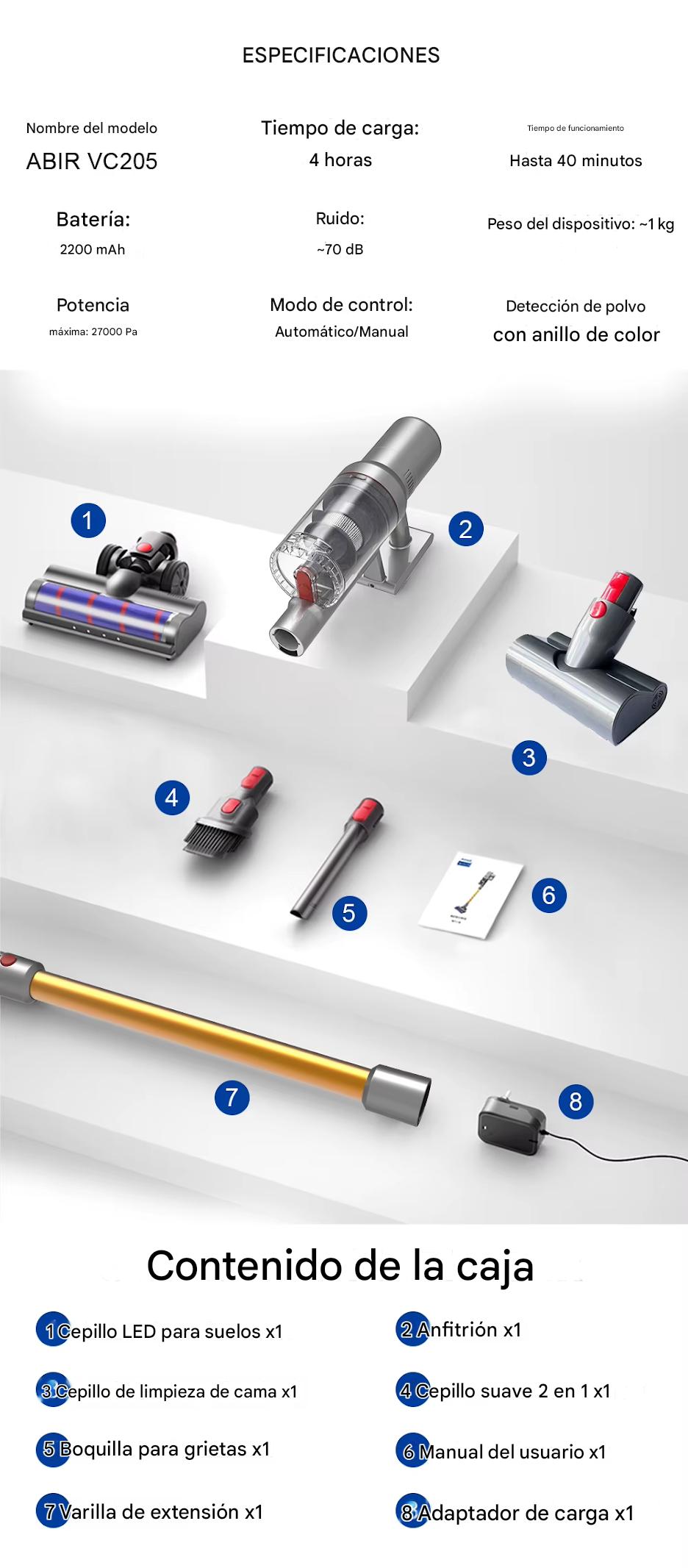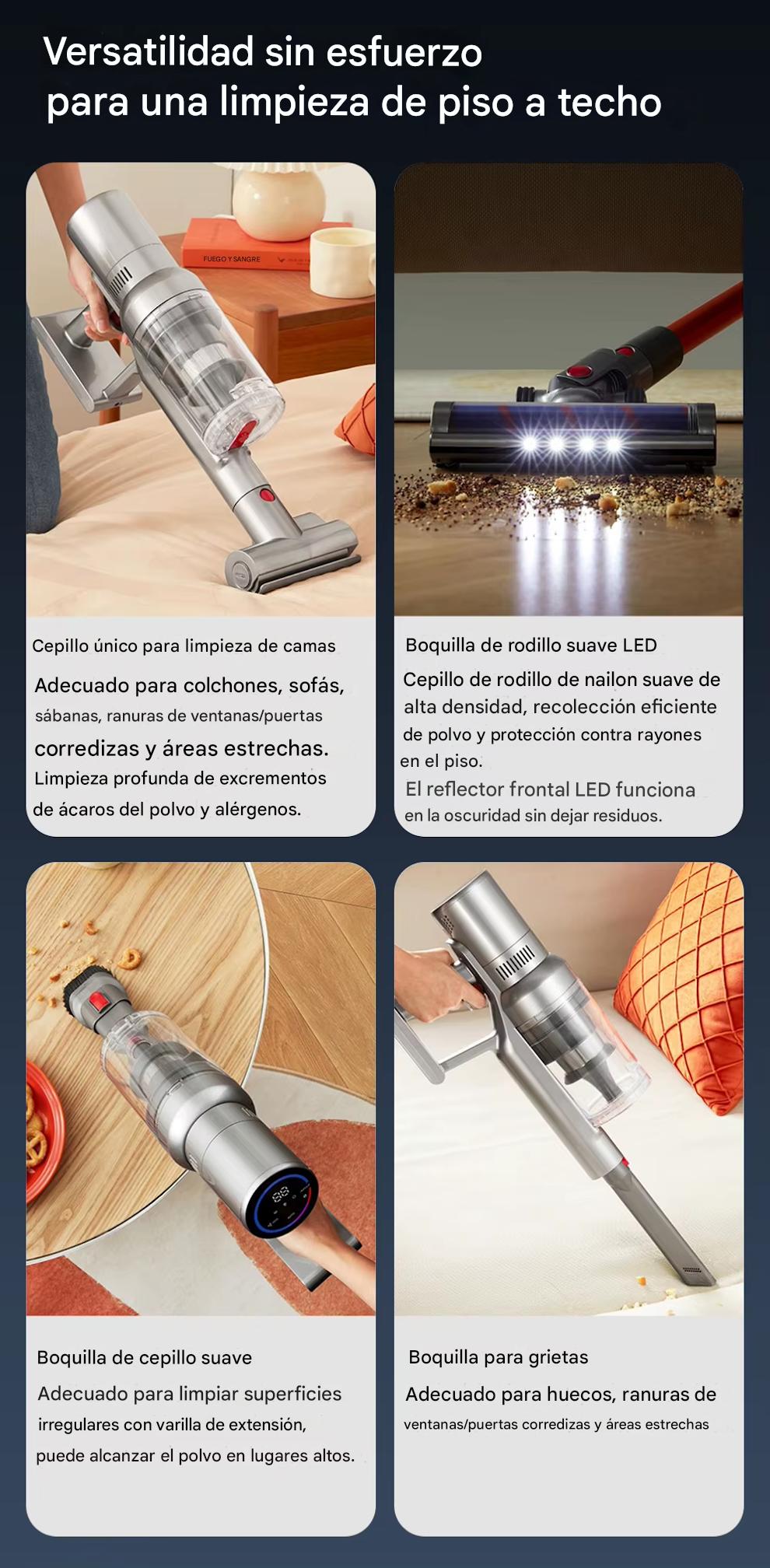 11.Incluye un exclusivo cepillo para limpiar camas, boquilla para rincones, un cepillo suave 2 en 1 y un cepillo para pisos LED.Incluyendo 4 tipos de cabezales de cepillo que satisfacen todos sus requisitos.