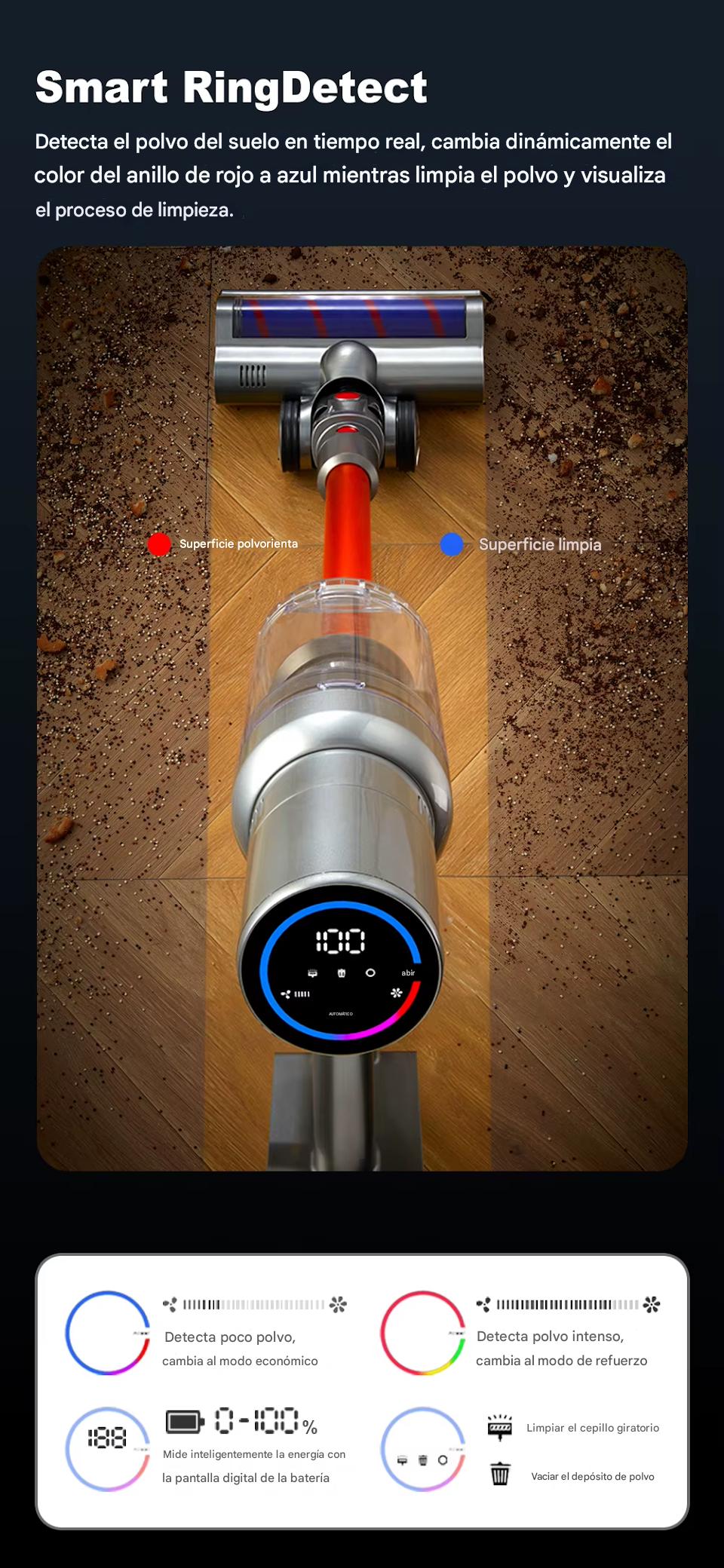 5.El anillo de luz con pantalla LED transmite de rojo a azul mientras limpia el polvo y visualiza el proceso de limpieza.