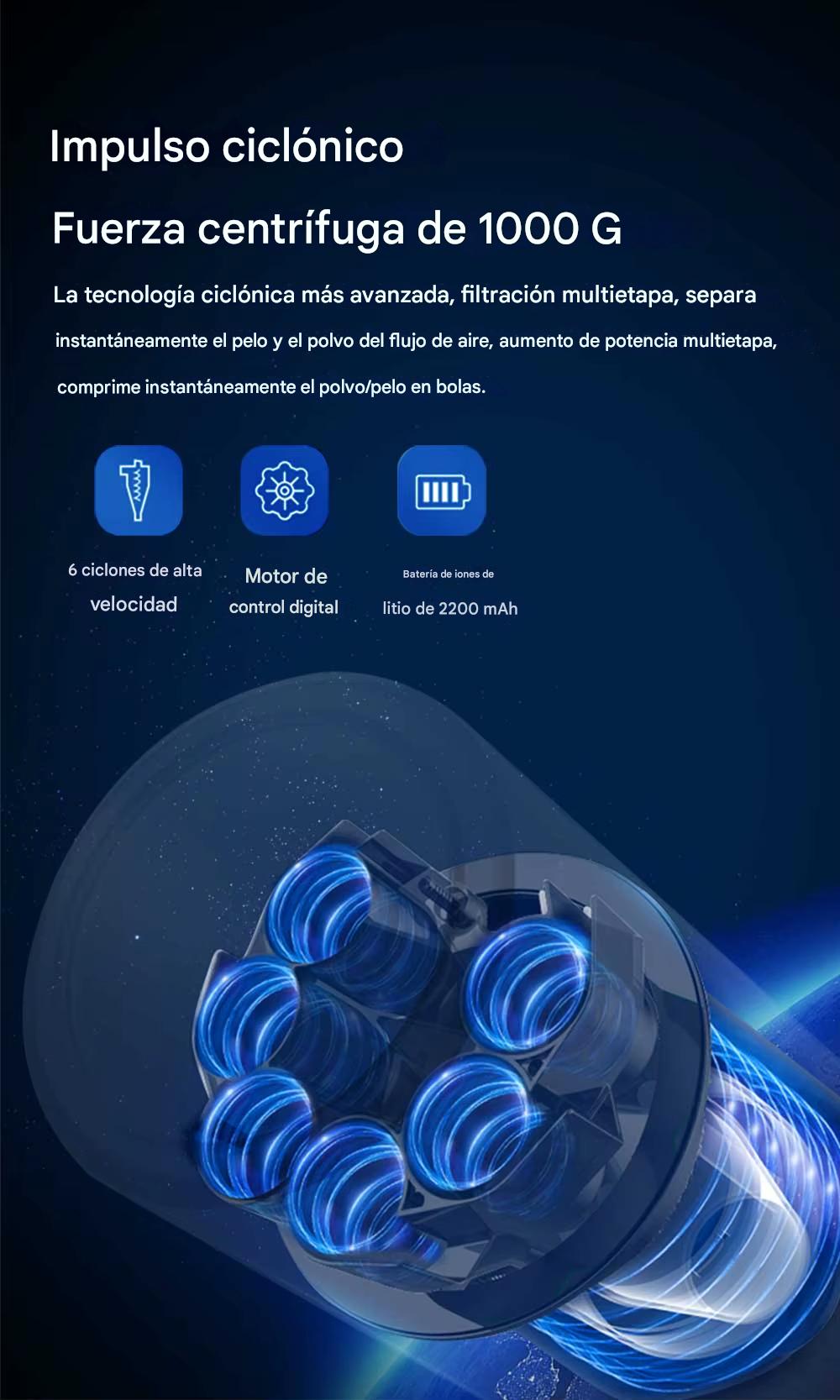 7.La tecnología ciclónica más avanzada, filtración en varias etapas, separa instantáneamente el pelaje, el polvo del flujo de aire, impulso de potencia en varias etapas, comprime instantáneamente el polvo y el cabello en bolas.