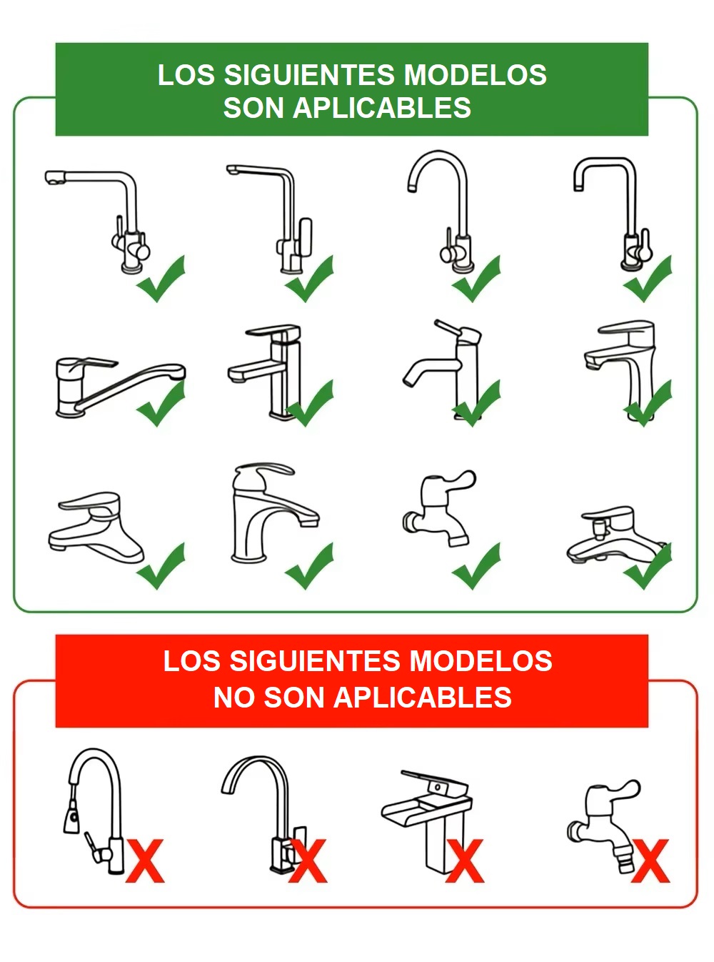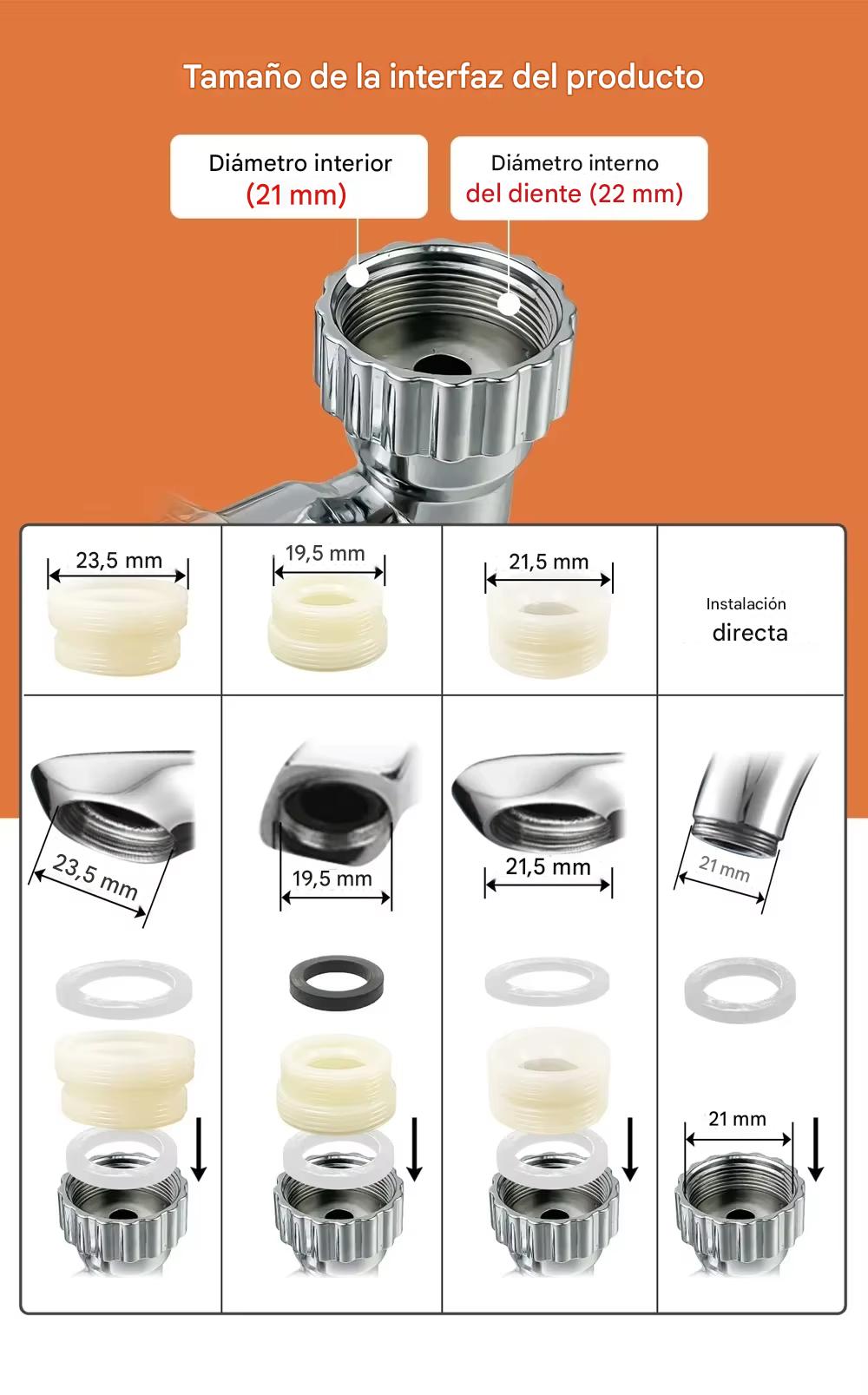 Interfaz internacional común, compatible con el 99% de los grifos. Los filtros de cuatro capas eliminan las impurezas del agua. Doble junta anti goteo.