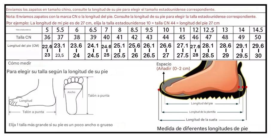 1. Elija la talla según la longitud del pie (¡no elija la talla según la talla habitual de su país!!!) Por ejemplo:Si midesDel talón a la puntamide 27 cm, elige la talla 44 = talla estadounidense 10